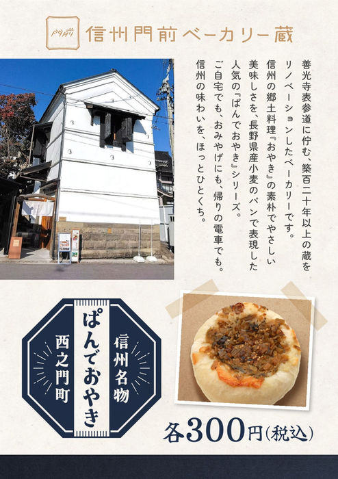 『信州門前ベーカリー蔵』は信州の郷土食のおやきを長野県産小麦を使ったパンで表現して《ぱんでおやき》シリーズとして販売しております。